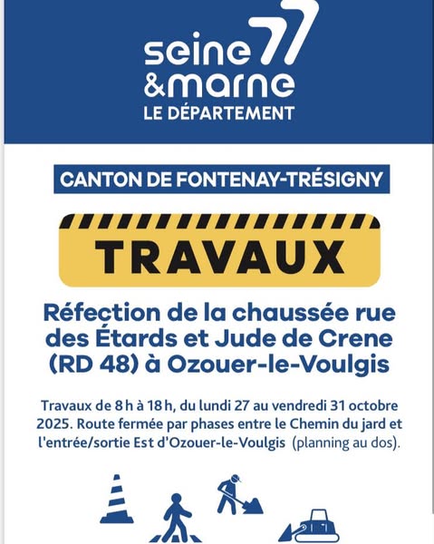 Le Département de Seine-et-Marne informe les usagers que des travaux de réfection de la chaussée auront lieu sur la RD 48, rue des Étards et Jude de Crene, du lundi […]